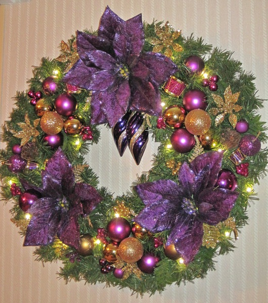 Item 336 Velvet, purple Poinsettias with purple and gold ornaments $68.00 on an evergreen wreath with battery-operated, warm-white, LIGHTS UP! LED lights on a timer. (Batteries included)