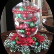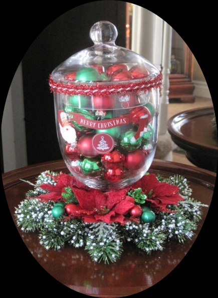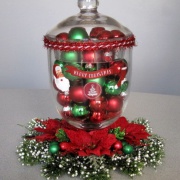 Item 436 Glass, apothecary jar filled with red and green ornaments.