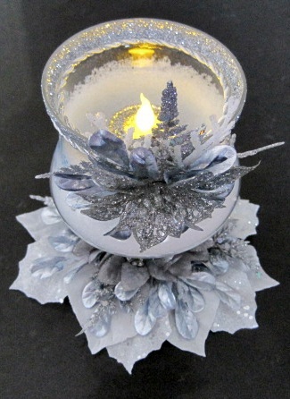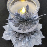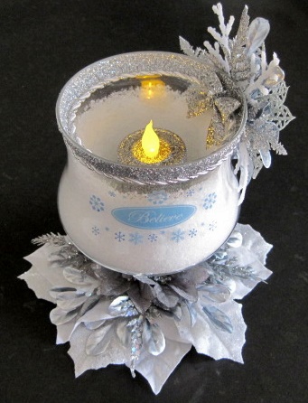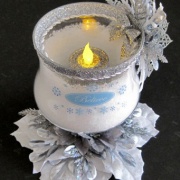 Item 379 "Snow-filled" glass, tealight holder with white and silver $30.00 ribbon, leaves and Poinsettia. "Believe" embossed on one LIGHTS UP! side. "Warm Wishes" on opposite side. Battery-operated, on/ Height: 8" Width: 4" off, silver tealight included. (DO NOT use real flame candle)