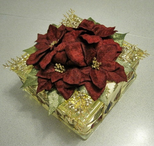 $45.00 topped with burgundy Poinsettias and gold accents. Block is