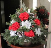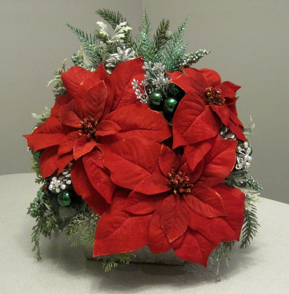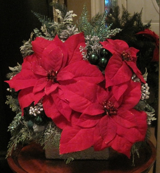 Item 126 Red Poinsettias with silver pinecones, emerald ornaments,