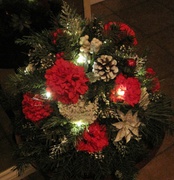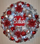 Item 372 White, glittery Poinsettias with red, silver and white $65.00 ornaments on a silver, tinsel wreath with battery-operated, LIGHTS UP! cool-white, LED lights on a timer. (Batteries included)