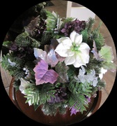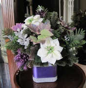 Item 370 White, mini Poinsettias with pinecones, berries, evergreens $68.00 and purple, glittery leaves in a square, glass vase wrapped Height: 14" Width: 14" with a violet, silk ribbon and rhinestones - all-around.