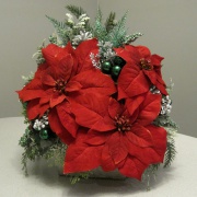 $45.00 Red, velvet Poinsettias, ornaments and evergreens surround