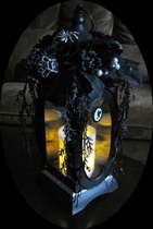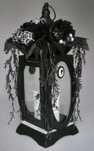 Item 240 Black and silver pumpkins, spiders, and mini roses $58.00 on a black, metal lantern with a battery-operated LIGHTS UP! candle on a timer. (Batteries included) Height: 18" Width: 10"