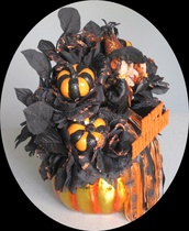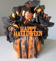 Item 119 Black and orange pumpkins, orange sparkly Roses, black $48.00 leaves and a very, welcoming Witch sitting in a gold and Height: 12" Width: 12" orange, ceramic pumpkin - one-sided.